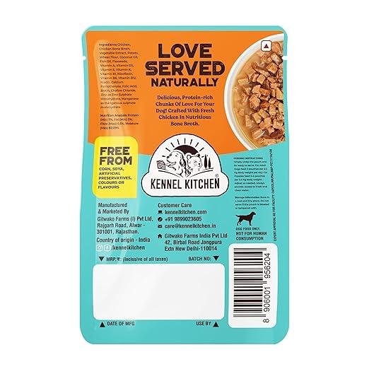 - Kennel Kitchen wet dog food is made with real chunks of chicken and chicken liver in a savoury gravy. It's packed with protein and entirely free from fillers, corn, soy, and wheat.