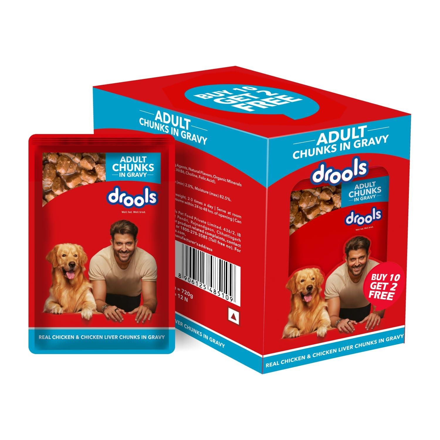 Drools Adult Wet Dog Food, Real Chicken and Chicken Liver Chunks in Gravy,10 Pouches + 2 Pouches Free (12 x 60g)
